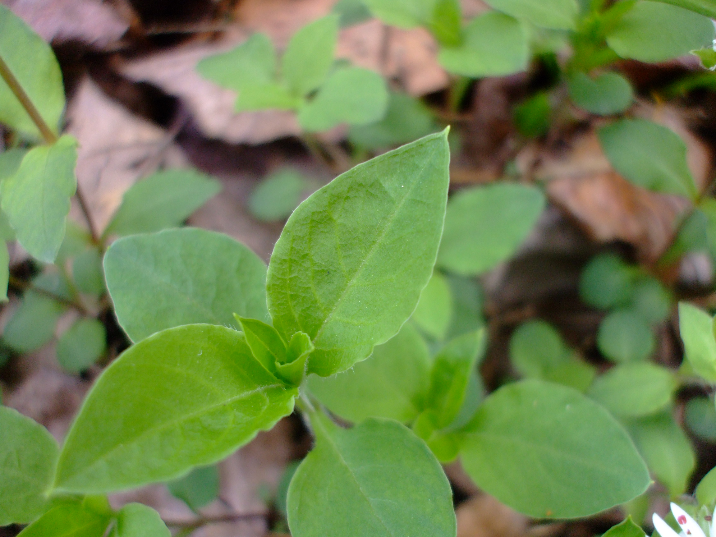 Stellaria pubera, or Star Chickweed, is native to about the eastern third of the US, but is centralized on the inner portion of that, namely the Appalachian area. It is a perennial that grows in dry to moist, partially shaded woods and along woodland edges. It blooms in early to late spring with showy white flowers.