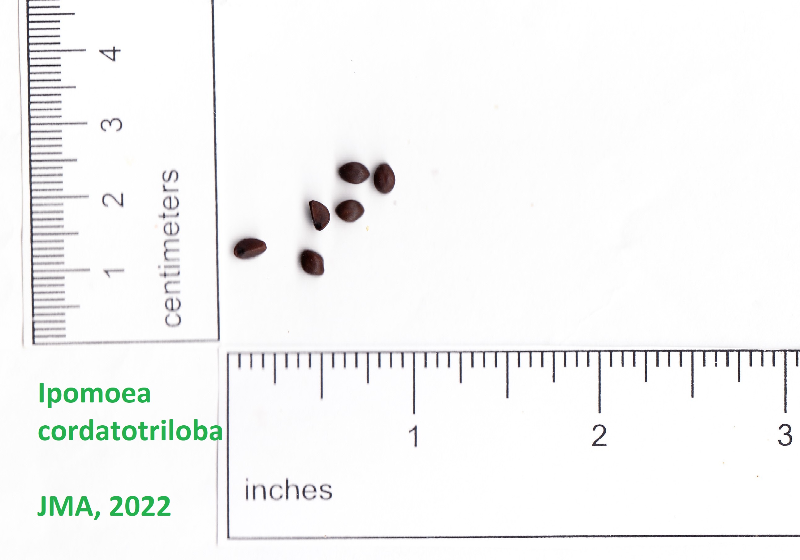 Ipomoea cordatotriloba, or Tievine, is native to the much of the southeastern US. It is a tender perennial that is grown as an annual in some places with cold winters; it grows in a variety of places, including woods and along woodland edges, ravines, riverbanks, as well as along roadsides and waste areas. It blooms year round where warm enough, and in late summer into fall in colder areas, with ypink to light purple flowers.