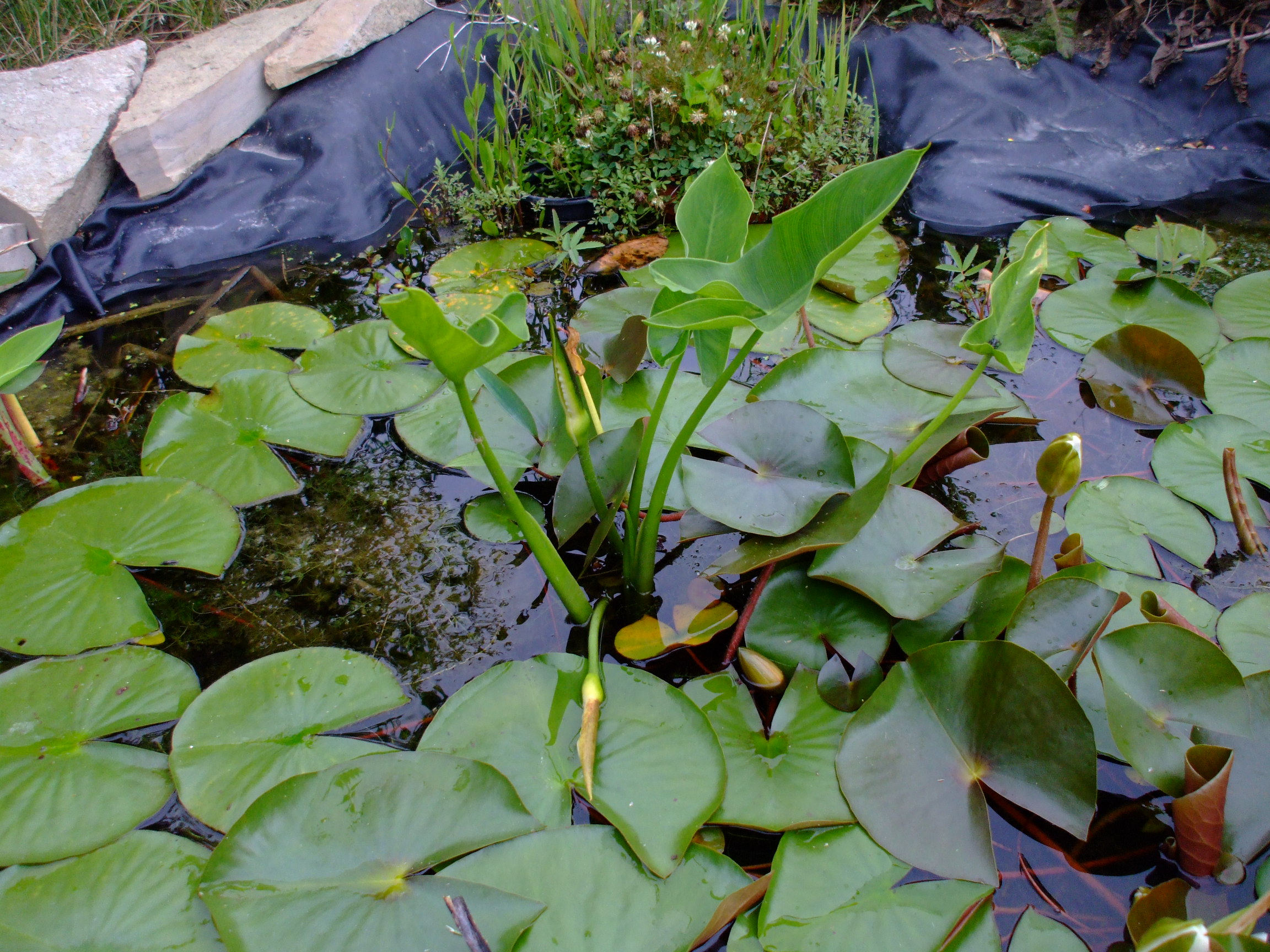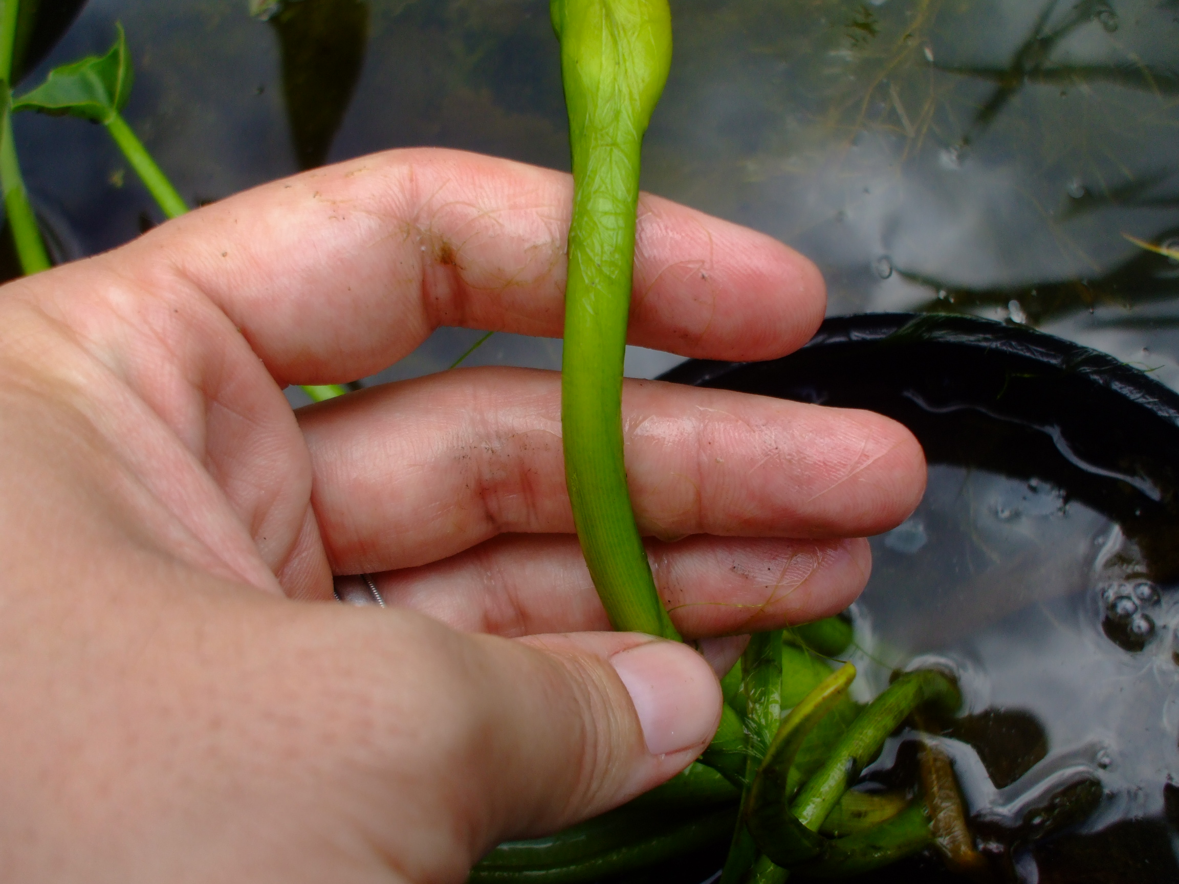 Peltandra virginica, or Arrow Arum, is native to the much of the eastern half US,and is also found in Oregon and California. It is an aquatic perennial that grows on pond margins, ditches, swamps, bogs, marshes and other wet areas. It blooms in early to mid spring with green-white flowers.