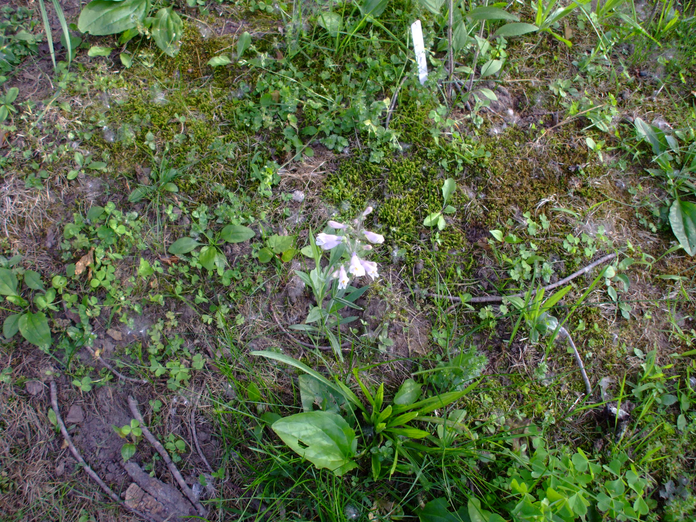 Penstemon gracilis, or Slender Beardtongue, is native to the Central US. It is a perennial that grows in open prairies, meadows and savananas, open glades and bluffs and along railroads. It blooms in mid to late spring into early summer with white flowers with purple streaks inside.