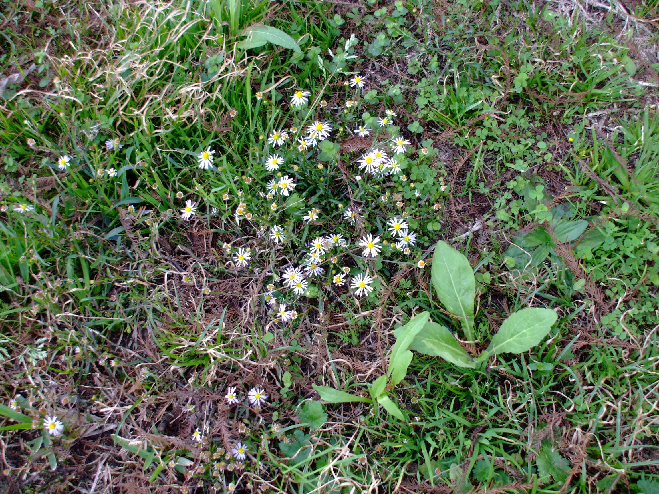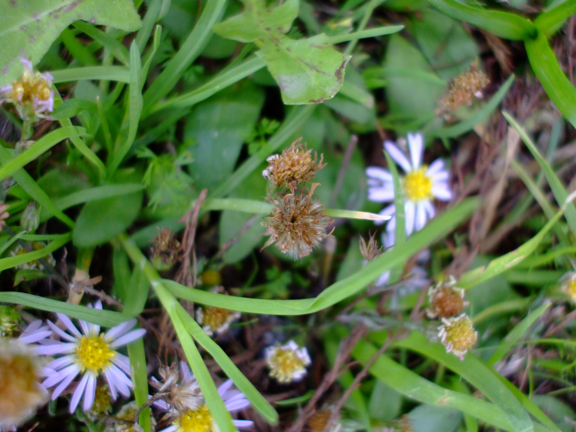Symphyotrichum divaricatum, or Southern Saltmarsh Aster, is native to the South-Central United States. It is an annual that grows in swamps, marshes, wet meadows and fields, pond margins, but can also be found in fields and lawns, and it grows back well, even in the face of persistent mowing. It blooms from summer into late winter, with purple-blue flowers.